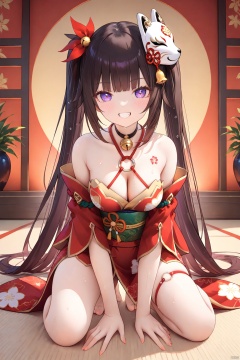 sparkleSR,long hair,breasts,bangs,brown hair, ((black hair)) ,gloves,bare shoulders,twintails,very long hair,purple eyes,japanese clothes, cleavage,long sleeves,detached sleeves,wide sleeves, choker,black gloves,kimono,grin,sash,mask,obi,fish,mask on head,red kimono, fox mask,goldfish,flaky hem,tattoo,red thigh strap,((o-ring)),