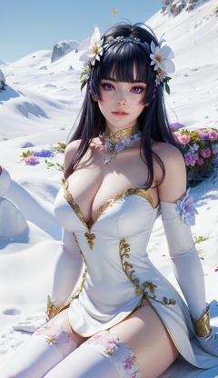 masterpiece,highres,1girl,solo,sfw,<lora:add_detail:0.3>,looking at viewer,dynamic_angle,thighhighs,((beautiful Dress+stocking):1.25),((flower headdress:1.45)),((white theme:1.5)),snow,outdoors,snowflakes,3D graphics,nyotengu,dynamic pose,purple eyes,<lora:nyotengu-000004:0.75>,