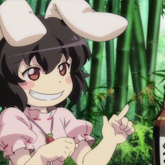 masterpiece, best quality, <lora:tgm-xl-a3.1:1>, anime coloring, 1girl, solo, inaba tewi, animal ears, rabbit ears, red eyes, black hair, grin, short hair, bamboo, smile, nature, forest, bamboo forest, blush stickers, bottle, jewelry, parody, pendant, necklace, carrot, carrot necklace