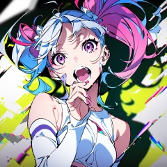 masterpiece, best quality, <lora:yoneyama-a31:1>,yoneyama mai, 1girl, solo, pink nails, open mouth, long hair, pink eyes, looking at viewer, white hair, hair bun, nail polish, fingernails, twintails, double bun, upper body, bangs, blue hair, floating hair, shirt, bandaid, glitch, white shirt, teeth, detached sleeves, grey hair, purple eyes, pink hair