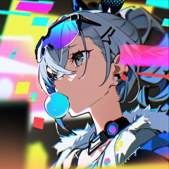 masterpiece, best quality,<lora:yoneyama-a31:1>,yoneyama mai, hair ornament, chewing gum, bubble blowing,1girl, solo,silver wolf \(honkai: star rail\), honkai: star rail,grey hair, sunglasses, portrait,blurry, chromatic aberration, colorful, holographic interface, drone,