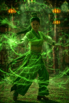 green-poison-magic,using green-poison-magic,using green-magic,green-aura,green-magic,dancing,ancient-costume,fighting stance,1girl,solo,full body,looking at viewer,blurry,green eyes,chinese clothes,blurry background,black hair,long hair,jewelry,<lora:magic_fighting_green_512_dreamshaper_8_2:0.8>,