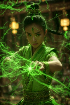 green-poison-magic,using green-poison-magic,using green-magic,green-aura,green-magic,dancing,ancient-costume,fighting stance,1girl,solo,looking at viewer,blurry,green eyes,chinese clothes,upper body,blurry background,black hair,facial mark,forehead mark,long hair,jewelry,<lora:magic_fighting_green_512_dreamshaper_8_2:0.8>,