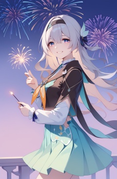 a girl named liuying,liuying,1girl,sidelocks,white shirt,black jacket,cropped jacket,long sleeves,orange neckerchief,collared shirt,<lora:流萤2pony-000008:1>,<lora:photo_v2:0.0>,smile,from side, holding fireworks, looking at viewer, holding, smile, sidelocks, pleated skirt, black jacket, white shirt, blue skirt, cropped jacket, long sleeves, white bow, normal quality, sparkler, orange neckerchief, night sky, miniskirt, (score_9,score_8_up,score_7_up),(masterpiece,best quality,high quality:1.2),absurdres, prefect lighting, very aesthetic, anime BREAK