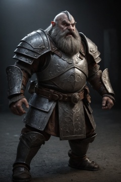 Battle dwarf, plate armor, grey face, in darkness, nervous and shady atmosphere, fighting stance