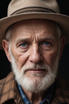 Hyperrealistic fine art photography, film photography aesthetic, dark background emphasizing facial features, intense close-up portrait of an elderly man with piercing blue eyes, weathered skin, pronounced wrinkles, white full beard, stern expression, wearing a brown felt hat and plaid shirt with visible collar, natural lighting accentuating skin texture, high contrast and sharp detail, emphasis on character and emotion, vibrant, whimsical