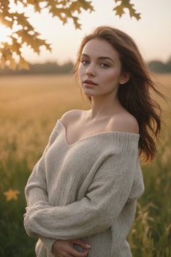 Masterpiece, 8k resolution, extremely high-resolution details, high detail, incredibly lifelike, realistic, photorealistic, fine texture, portrait of a beautiful woman with delicate features, emotional expression, pastel colors, looking at viewer, solo focus, wearing an off-shoulder oversized sweater, thin waist, cleavage, in a field of grass with maple trees during golden hour, soft lighting, dreamy atmosphere, ethereal, film photograpy, film grain,