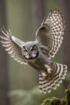Majestic Northern Hawk Owl in flight with wings fully extended, intricate feather patterns, sharp focused eyes conveying intensity, soft grey and white plumage, natural light highlighting subtle textures, smooth bokeh background merging cool blues and soft earth tones, wildlife photography capturing dynamic motion, expert use of shutter speed freezing delicate movement, absence of human interference, pure wilderness portrayal, optical excellence revealing minute details, high-resolution capture showing individual barbs on feathers, crisp contrast emphasizing the owl's natural camouflage, film photography aesthetic, vibrant, whimsical