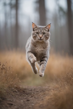 Majestic cat in flight, natural light highlighting subtle textures, smooth bokeh background merging cool blues and soft earth tones, expert use of shutter speed freezing delicate movement, absence of human interference, pure wilderness portrayal, optical excellence revealing minute details, film photography aesthetic, vibrant, whimsical