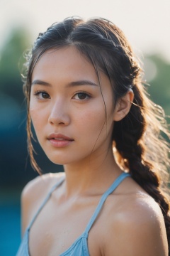 Young Asian woman with long hair, braided bangs, short pigtails hairstyle, seductive gaze, wet face, delicate facial features, high-resolution portrait, detailed medium format photo, blue sky, surreal photography, light leak, shallow depth of field, bokeh effect, whimsical, hq scan