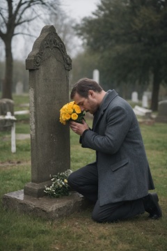 A man kneeling by a gravestone, his face etched with profound pain and sorrow, weathered gravestone adorned with flowers, delicate ethereal wisp of a spirit hovering above, tranquil overcast cemetery, stillness broken by the man's grief and the spirit's presence, intricate natural lighting, depth of field, photorealistic, realism, art photography, atmospheric perspective, diffusion, pore correlation, skin imperfections, Nikon D850, 80mm Sigma f2, high quality, sharp focus, breathtaking, masterpiece, best quality,