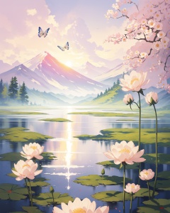 scenery,(Misty valley, Sunrise, Mountains, Fog, Serenity, Tranquility,Lotus blooms, Lily pads, Dragonflies, Calm water, Pink hues, Morning mist:1.3),outdoors,cloud,light particles,beautiful detailed sky,beautiful detailed glow,best shadow,from_side,depth of field,panorama,(masterpiece, best quality, beautiful and aesthetic:1.3),(beautiful and clear background:1.2),extremely detailed CG,ultra-detailed,beautiful concept illustration,illustration,extremely fine and beautiful,perfect details,<lora:YOUHUA-000015:1>,oil painting \(medium\),