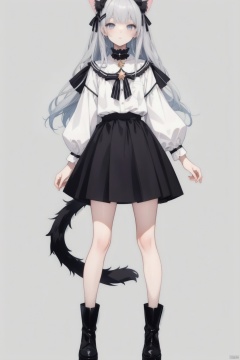 Close-up of a man wearing a skirt and boots,Character Design,Character portrait,Whole body,Standing,A girl on gray background,Seventeen,Gentle personality,Silver long hair,Black cat ears,Cat's Tail,Bow Hairpin,blue grey eyes,((Black and white skirt)),Collar, Anime full body illustration, pretty Anime character design, Single character full body, High-quality anime art style, Adaptable personality, Suitable for whole body, Anime character design, High quality character design, Clear clothing design, Star witch clothes,  Official character illustrations, Shoujo manga character design