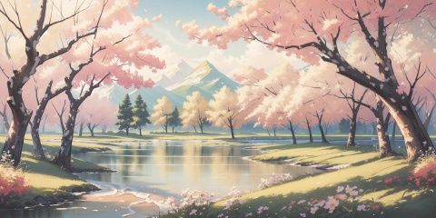 scenery,outdoors,light particles,beautiful detailed sky,beautiful detailed glow,best shadow,panorama,(Lake, Lakeside, Forest, Trees, Reflection, Serenity, Wildlife, Tranquility:1.3),(River, Moonlit, Forest, Boat, Reflections, Peacefulness:1.2),(Cherry blossoms, Garden path, Dawn light, Sakura petals, Tranquil setting, Japanese elegance:1.1),(masterpiece, best quality, beautiful and aesthetic:1.3),extremely detailed CG,ultra-detailed,beautiful concept illustration,illustration,extremely fine and beautiful,perfect details,<lora:YOUHUA-000018:1>,oil painting \(medium\),