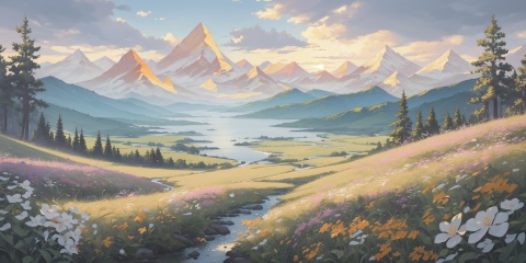 scenery,outdoors,light particles,beautiful detailed sky,beautiful detailed glow,best shadow,panorama,(Mountains, Snow, Peaks, Glacier, Ice, Clouds, Sunlight:1.3),(Mountain peak, Sunrise, Hiking trail, Morning colors, Summit view, Adventure:1.2),(Meadow flowers, Butterflies, Wildflower carpet, Springtime blooms, English landscape, Meadow breeze:1.1),(masterpiece, best quality, beautiful and aesthetic:1.3),extremely detailed CG,ultra-detailed,beautiful concept illustration,illustration,extremely fine and beautiful,perfect details,<lora:YOUHUA-000018:1>,oil painting \(medium\),