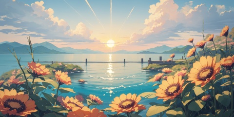 scenery,outdoors,light particles,beautiful detailed sky,beautiful detailed glow,best shadow,panorama,(Coral, Reef, Fish, Seaweed, Colorful, Underwater, Diversity, Serenity:1.3),(Mist-covered lake, Fishing, Sunrise, Tranquility, Fishing rod, Nature sounds:1.2),(Sunflowers, Bees, Rustling stalks, Sunshine, Yellow hues, Summer heat:1.1),(masterpiece, best quality, beautiful and aesthetic:1.3),extremely detailed CG,ultra-detailed,beautiful concept illustration,illustration,extremely fine and beautiful,perfect details,<lora:YOUHUA-000018:1>,oil painting \(medium\),