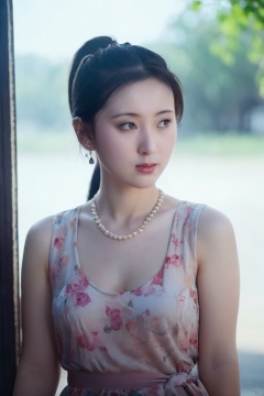 Cinematic,Kodak 5207 65mm flim , 1girl, solo, black hair, dress, brown eyes, jewelry, upper body, ponytail, necklace, lips, Slow shutter, Shot by Arri Alexa 65 IMAX,dusty,film,grainy, nostalgia, low key light,Ultra photoreal, Insane Details, 16K, full color grading ,Realistic, --ar 3:4 --style raw --s 750 --v 6.0 --iw 1