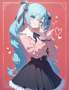 icecake,1girl, solo, skirt, hatsune miku, twintails, shirt, long hair, smile, pink shirt, ribbon, looking at viewer, black skirt, red background, heart, hair ribbon, long sleeves, bangs, jirai kei, hair ornament, black ribbon, aqua hair, aqua eyes, frills, grin, heart hair ornament, cowboy shot, puffy sleeves, facial mark, from side, blue hair, hands up, nail polish, looking to the side, teeth, mask