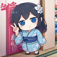 1girl, fumo doll, chibi, solo, long hair, blush, looking up, from above, half updo, open clothes, blue kimono, hair ornament, socks, hand puppet, white flower, white socks, sash, flower, looking at viewer, hair flower, light blush, yukata, holding, parted lips, long sleeves, no shoes, sack, obi, dried footwear, full body, :>, standing, blue eyes, head tilt, wide sleeves, furisode, black hair, braid, blush stickers, floral background, japanese clothes, kimono, print kimono, floral print, score_9, score_8_up, score_7_up, source_anime <lora:XL_fumo_(doll)(pony):1>