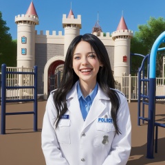 zero,1girl,solo,realistic,black hair,long hair,looking at viewer,blue eyes,lips,photorealistic,<lora:girl-000002:0.8>,highres,absurdres,police_uniform,labcoat,smile,laughing,smirk,city,castle,zoo,playground,