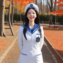 zero,1girl,solo,realistic,black hair,long hair,looking at viewer,blue eyes,lips,photorealistic,<lora:girl-000002:0.8>,highres,absurdres,police_uniform,evening_gown,sailor,nurse,space_suit,labcoat,smile,laughing,:d,smirk,in spring,in winter,(autumn maple forest:1.3),(very few fallen leaves),(path),in summer,city,castle,zoo,playground,