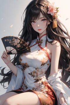 , 1girl, solo, long hair, breasts, dress, china dress, brown hair, chinese clothes, large breasts, sitting, looking at viewer, white dress, bare shoulders, white background, sleeveless, hair ornament, thighs, floral print, sleeveless dress, bangs, hand fan, simple background, flower, pelvic curtain, bare arms, pink eyes, holding fan, folding fan, hair flower, petals, closed mouth, holding
