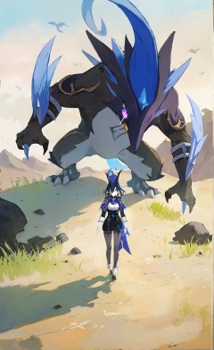 8k, best quality, masterpiece, (ultra-detailed), <lora:keluo-A3-Tanger:0.8>, 1 Geovishap and 1 Clorinde, Clorinde, def clothes, small Geovishap, black skin monster, outdoors, pokemon (creature) grass, 1girl, looking at viewer, full_shot, epic level picture, film lens, oil_painting, super high detail, beauty and the beast, desert, rock, sandstorm, boundless,
