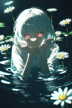 best quality,(chromatic aberration),(beautiful young female:1.4),(streaming tears),sad,(daisy),(daisy),(daisy),looking at viewer,partially submerged,both hands on own cheek,{see-through long shirt},{no bra},(white hair, short hair, bangs:1.2),(glowing eyes),ripples,dark water,black background,(prismatic),