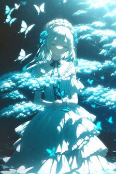 (masterpiece),(best quality),illustration,ultra detailed,hdr,Depth of field,(colorful),This is a masterpiece that exudes exceptional quality. The illustration is ultra-detailed,utilizing HDR technology to create a sense of depth. The subject matter is an original,delicate,and beautiful artwork,vibrant with color and filled with fantastical elements. The girl is sitting by a deep sea,surrounded by flowing water,with a dull blue World Tree in the background,situated in a cemetery. The serene and dreamy atmosphere gives the entire scene a soulful and enchanting quality. Her pale complexion,azure blue eyes that glow,and silver hair adorned with flowers create a captivating portrait. She wears a Lolita-inspired fashion,expressionless with her mouth closed. The backgrounds range from white,transparent,circular options,and there are also flying translucent blue butterflies that add a sense of liveliness to the piece.,