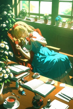 masterpiece,best quality,illustration,ultra detailed,hdr,Depth of field,(colorful),Artist rokusai,shanghai doll,alice margatroid,cup,hairband,closed eyes,bow,window,blonde hair,book,capelet,hair bow,flower,red bow,sleeping,short hair,curtains,plant,dress,long hair,1girl,blue dress,teacup,red hairband,chair,open book,paper,holding,