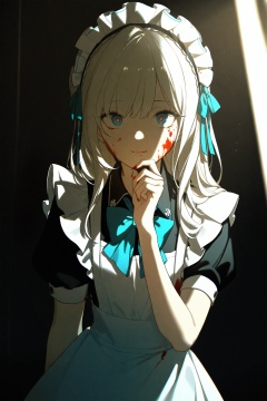masterpiece,best quality,illustration,ultra detailed,hdr,Depth of field,(colorful),Artist:ask (askzy),Amazing,highres,intricate detail,best illumination,best shadow,(late at night),night,(Dark blue theme),Depth of field,window,White curtains,1girl,loli,solo,bangs,blood on face,dark persona,white hair,Blue bow tie,maid,Short sleeve,apron,maid headdress,long hair,hand on own chin,teary-eyed,blood on clothes,blood,maid apron,