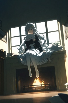 (1girl:0.6),thin,very long hair,grey hair,deep grey hair end,grey eyes,(detailed eyes),small breasts,(black coat),white lining,white skirt,socks,shoes,closed mouth,(happy),smile,star hairpin,Bow head,sitting in bed,hugging Pillow,{white flower},cityscape in window,pantyhose,fireplace,(dark night),masterpiece,best quality,official art,extremely detailed CG unity 8k wallpaper,cozy anime,backlight,(wide shot:0.95),Dynamic angle,fanxing,(full body),cozy anime,