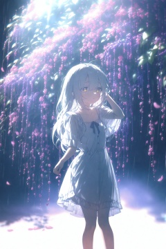 (masterpiece),(best quality),illustration,ultra detailed,hdr,Depth of field,(colorful),loli,white background,Dundar effect,a lot of purple vines,vines covering half of the painting,delicate plant details,a girl,girl,petite girl,long white hair,golden pupils,white dress,bare feet,side,side,upper body,head up,sad eyes,rain,light,figure light,petals,purple filter,left,fog,dream,unreal,Blur,float light,