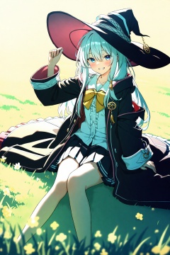 (masterpiece),(best quality),illustration,ultra detailed,hdr,Depth of field,(colorful),nai3 Style,1girl,elaina (majo no tabitabi),solo,hat,witch hat,long hair,skirt,black headwear,smile,white hair,sailor collar,shirt,pleated skirt,blue eyes,long sleeves,hair between eyes,hand on headwear,sitting,white shirt,looking at viewer,bow,blush,robe,black robe,black skirt,open robe,white background,white sailor collar,purple eyes,grin,yellow bow,school uniform,bowtie,open clothes,grass,black coat,