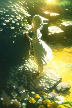 (masterpiece),(best quality),illustration,ultra detailed,hdr,Depth of field,(colorful),loli,yellow theme,the setting sun,Chamomile,Chamomile,cornflower,vines,forest,ruins,lens flare,hdr,Tyndall effect,damp,wet,1girl,bare shoulders,broken glass,broken wall,white hair,white dress,braid,white robe,closed mouth,looking up,standing,medium hair,standing,solo,