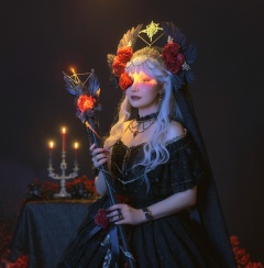 (A crow stands on the woman's shoulder:1.5),gothic girl,1girl,red flower,solo,flower,dress,ring,black dress,jewelry,red rose,candle,rose,glowing,long hair,holding,veil,hat,white hair,wand,hair ornament,hair flower,off-shoulder dress,looking at viewer,off shoulder,glowing eyes,facial mark,nail polish,exquisite makeup,gothic-style clothing,the refracted sunlight shines on the face and hands,the refracted sunlight shines on the face,rose scepter,<lora:乌鸦少女-000004:0.4>,kind_smile,(path),nature,sea,