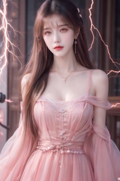 1girl,Bangs, off shoulder, colorful_hair, ((colorful hair)),golden dress, yellow eyes, chest, necklace, pink dress, earrings, floating hair, jewelry, sleeveless, very long hair,Looking at the observer, parted lips, pierced,energy,electricity,magic,tifa,sssr,blonde hair,jujingyi, wangyushan, dofas, forehead mark, (\yan yu\), qingyi