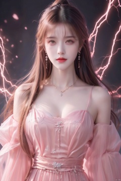 1girl,Bangs, off shoulder, colorful_hair, ((colorful hair)),golden dress, yellow eyes, chest, necklace, pink dress, earrings, floating hair, jewelry, sleeveless, very long hair,Looking at the observer, parted lips, pierced,energy,electricity,magic,tifa,sssr,blonde hair,jujingyi, wangyushan, dofas, forehead mark, (\yan yu\), qingyi