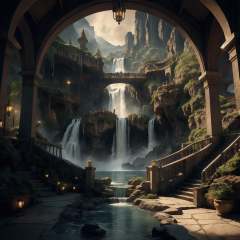 (highly detailed:1.3), wrench_elven_arch, a massive, multi-tiered elven palace adorned with flowing waterfalls, its cascades forming staircases between ethereal realms,Ultra-detail, (highres:1.1), best quality, (masterpiece:1.3), cinematic lighting,4esthet1c, <lora:AestheticScene:0.8>