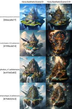 ((masterpiece)),((best quality)),8k,high detailed,ultra-detailed,illustration,concept art,fantasy,a floating island,candy tree,porcelain house, (floating waterfalls:1.1),(floating islands in the sky:1.2),magical creatures,capturing the otherworldly beauty of a floating fantasy realm,4esthet1c, <lora:AestheticScene:0>