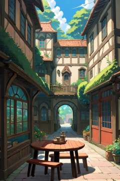 painting of a courtyard with a table and chairs and a bench,anime background art,relaxing concept art,anime scenery concept art,immensely detailed scene,a beautiful artwork illustration,detailed scenery,studio ghibli environment,environment design illustration,highly detailed scene,beautiful anime scene,anime scenery,detailed soft painting,ghibli studio style,environment painting,4esthet1c, <lora:AestheticSceneSDXL:0.8>