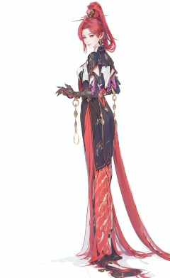 8k, best quality, masterpiece, (ultra-detailed), (high detailed skin), (white background:1.5), (full body), (white background:1.2), standing, looking at viewer, (solo), <lora:yinlin-v100:0.75>, yinlin, def clothes, 1girl, red hair, purple eyes, dress, hair stick, breasts, gloves, full_shot,