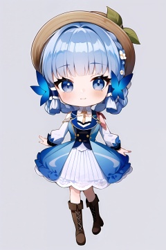 (masterpiece, best quality:1.2),insanely detailed,absurdres,ultra-highres,ultra-detailed,best quality,slender,kawaii,perfect symmetrical face,ultra cute girl,ultra cute face,ultra detailed eyes,ultra cute,ultra beautifu,<lora:kamisato ayakaV2-000006:1>,kamisato ayaka \(springbloom missive\),kamisato ayaka,1girl,solo,mole under eye,long sleeves,chibi,flower,hat,closed mouth,braid,boots,brown footwear,blue hair,smile,simple background,holding,white background,white flower,blush,puffy sleeves,hair ornament,brown headwear,full body,grey eyes,hair flower,looking at viewer,lace-up boots,blue dress,puffy long sleeves,lolita fashion,butterfly hair ornament,neck ruff,