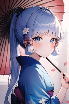 (masterpiece, best quality:1.2),insanely detailed,absurdres,ultra-highres,ultra-detailed,best quality,slender,kawaii,perfect symmetrical face,ultra cute girl,ultra cute face,ultra detailed eyes,ultra cute,ultra beautifu,<lora:kamisato ayakaV2-000006:1>,kamisato ayaka,1girl,japanese clothes,solo,kimono,grey eyes,hair ornament,smile,blue kimono,umbrella,bangs,ponytail,looking at viewer,blush,oil-paper umbrella,blue hair,holding,blunt bangs,holding umbrella,hair flower,long hair,from side,floral print,flower,upper body,petals,
