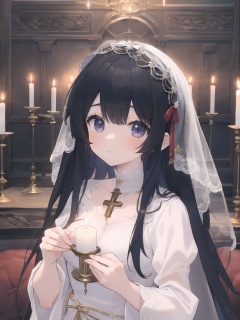 a girl in a white dress and a white veil with a candle in her hand and a cross on her head,Ayami Kojima,angelic,a flemish Baroque,gothic art,, (masterpiece,best quality,ultra_detailed,highres,absurdres:1.2)