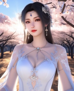 <lora:604-DA-XL-星辰变-姜立V2-新衣:0.8>(,1girl, ,best quality, ),looking at viewer,  ,, ultra detailed background,ultra detailed background,ultra realistic 8k cg,,masterpiece, (( , )), fiction,mole,  ,     ,see-through, lace, (cleavage),(((, solo, sun, , bare_tree, )))