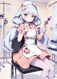 masterpiece, best quality, <lora:nicholas_XL_v1.0:0.8>,nicholas_\(azur_lane\), heterochromia, low_twintails,by kedama_milk,hair ornament,white_apron,white_pantyhose, wrist_cuffs,puffy_short_sleeves, collared_dress,nurse_cap,smile, holding_syringe, sitting on chair, infirmary,