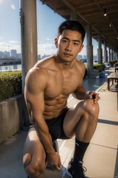 underwear ,1man, male focus,exquisite facial,handsome,charming eyes,solo,asian,short hair, black hair, outdoors, blurry, muscular,abs,kneehigh socks,footwear,blurry background,masterpiece,realistic,best quality,highly detailed,highres,