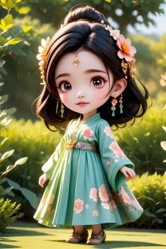 1girl, solo, hair ornament, chibi, black hair, hair flower, looking at viewer, jewelry, floral print, earrings, full body, brown eyes, wide sleeves, standing, outdoors,