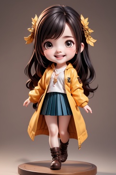 1girl, solo, chibi, footwear, skirt, long hair, boots, open mouth, skirt, hair ornament, looking at viewer, smile, jacket, full body, pleated skirt, long sleeves, shirt, open clothes, shirt, white jacket, standing, coat, blush, standing on one leg,